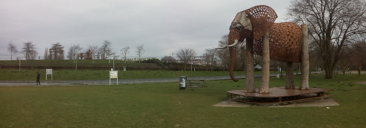 One of my local parks is the Westerpark and on my frequent cycle rides through it, I couldn’t help noticing a rather large and imposing sculpture. So last week I got off my trusty iron steed and took a few pictures of the poignantly named, ‘Weeping Elephant.’ It was created by artist, Jantien Mook. Mook’s mission statement;