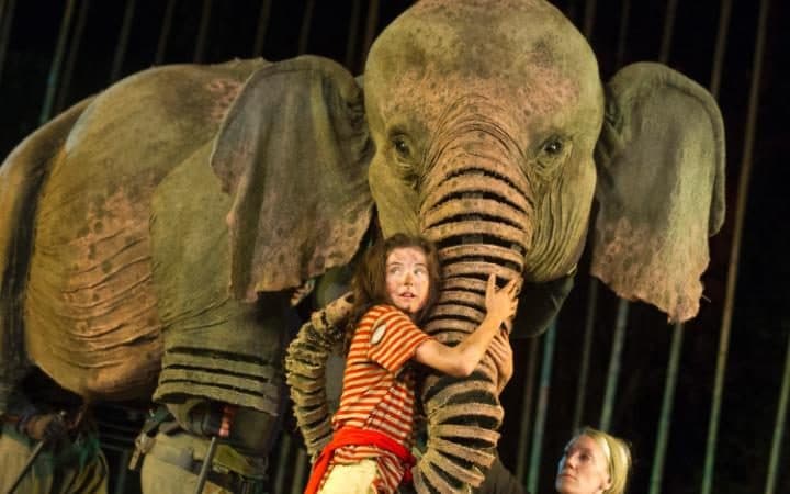 Thankfully we can console ourselves with the more uplifting story by Michael Morpurgo based on a real-life incident of an elephant rescuing a British child from the 2004 tsunami in Thailand. It was dramatised in London by the same puppet theatre that made War Horse. Here pictures of Ning Nong and the little girl he saved, Amber Own who is now in her twenties, and below Ning Nong’s puppet actor in the play, ‘Running Wild.’